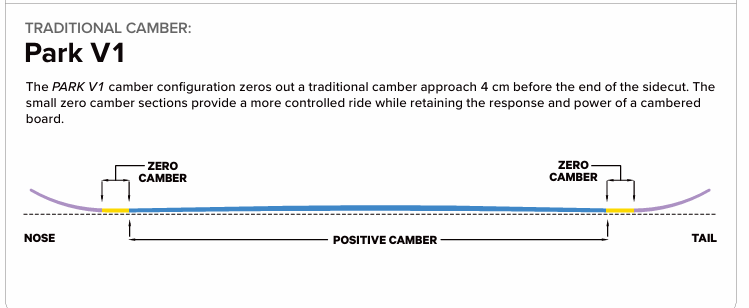 「Park V1」というキャンバー形状は、伝統的なキャンバーの端、サイドカットが終わる手前数センチで、キャンバーがフラット(ゼロ・キャンバー)になるように設計されています。