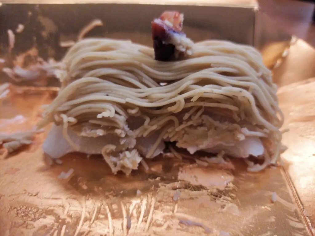 箱いっぱいに敷き詰められたマロンクリーム。インパクト満点な見た目に、この中身はどうなっているんだろう?と興味がわくばかり…