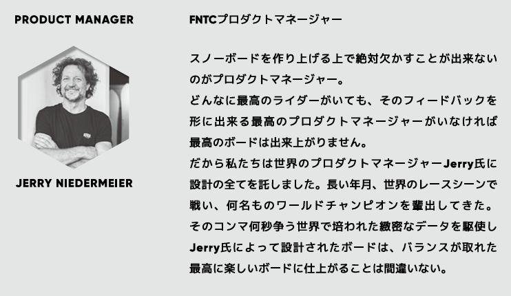 調べてみると、FNTCのボードはプロダクトマネージャーの「ジェリーさん」が長年ワールドカップシーンで培ったデータを駆使して設計されているとのこと。