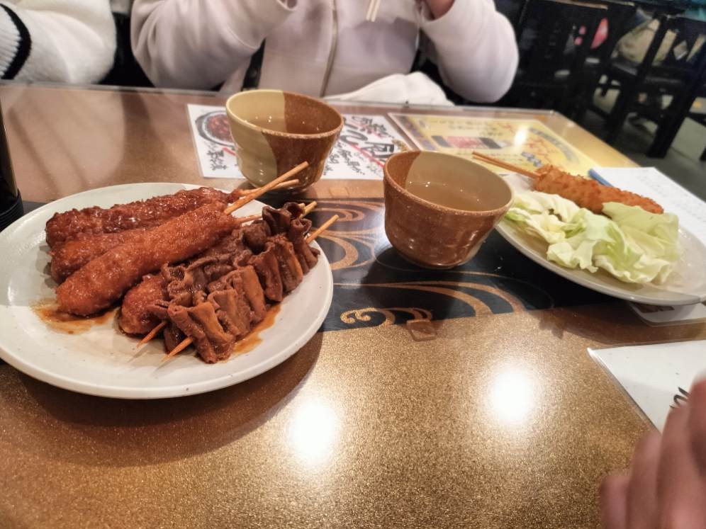 金ピカで有名な「玉家」さんで、揚げたての串カツにドテをいただきます。