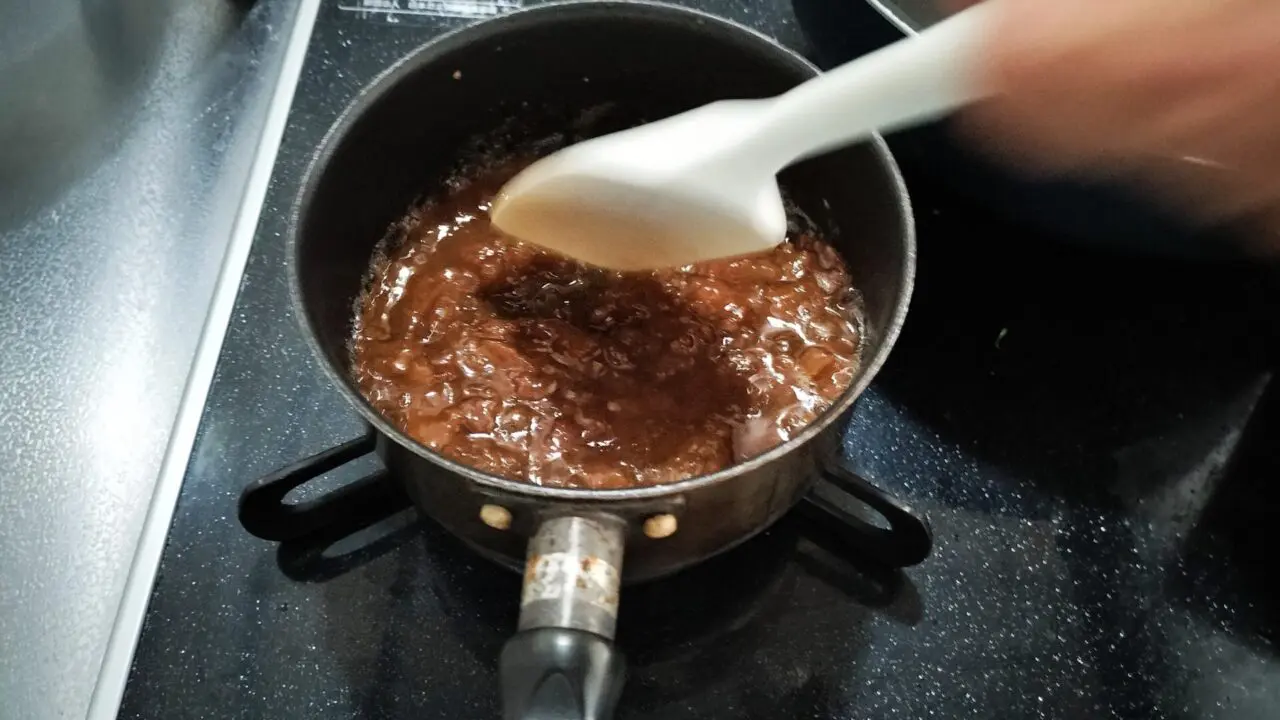 小鍋に火を入れて焦げ付かないようにヘラでかき混ぜて煮詰めていきます。