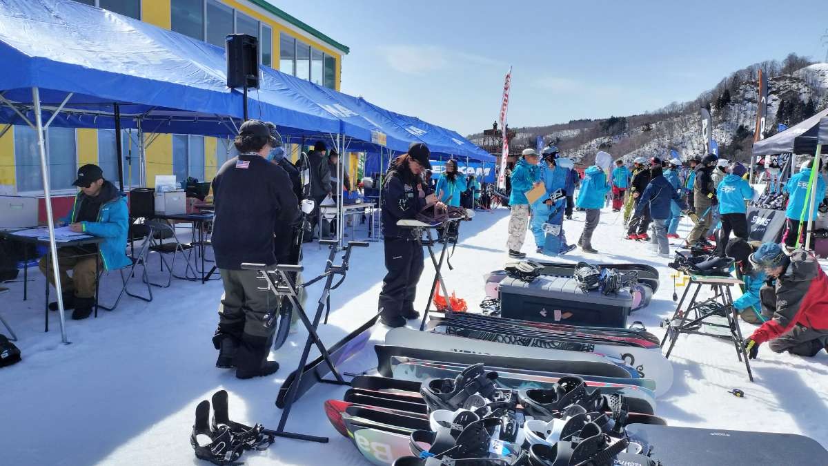高鷲スノーパークのセンターハウス前には、朝からズラリと各ブランドの最新モデルが並び、お祭り騒ぎのような活気に包まれていました。