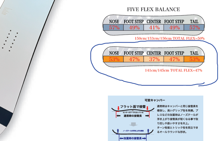正直、超ワイドボードなだけあって、たった数センチのサイズの違いでも、フレックスバランスがまったく違うんだろうなって感じました。