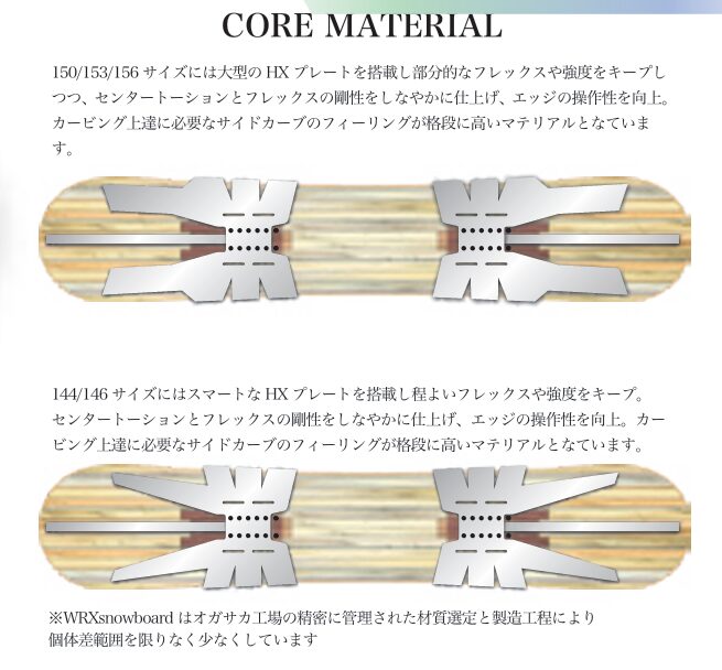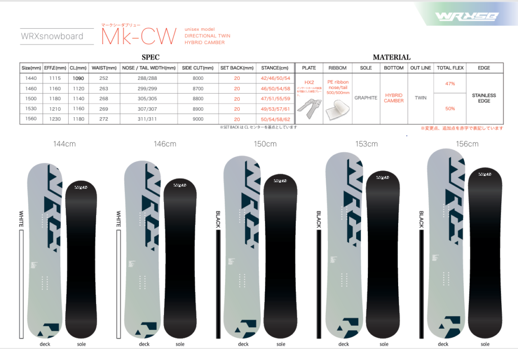 WRXSnowboard Mk-CWのボードに貼られたスペック表サイズ