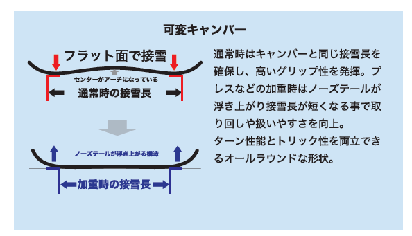 ノーズとテールはロッカー構造、中心はキャンバー構造になっています。